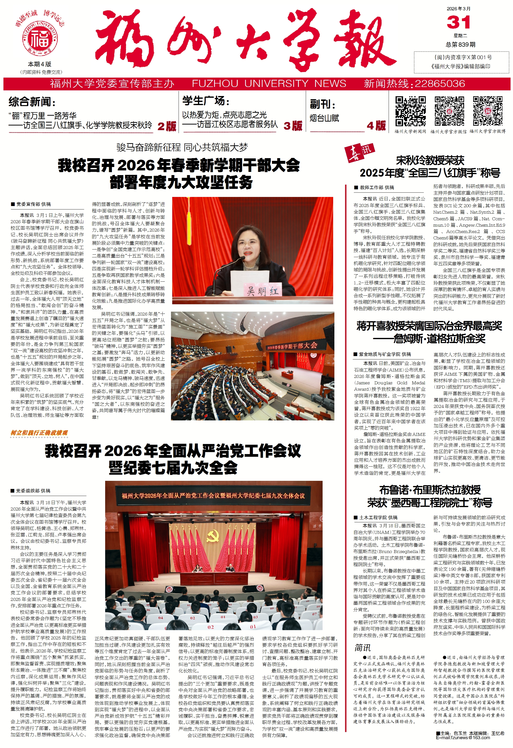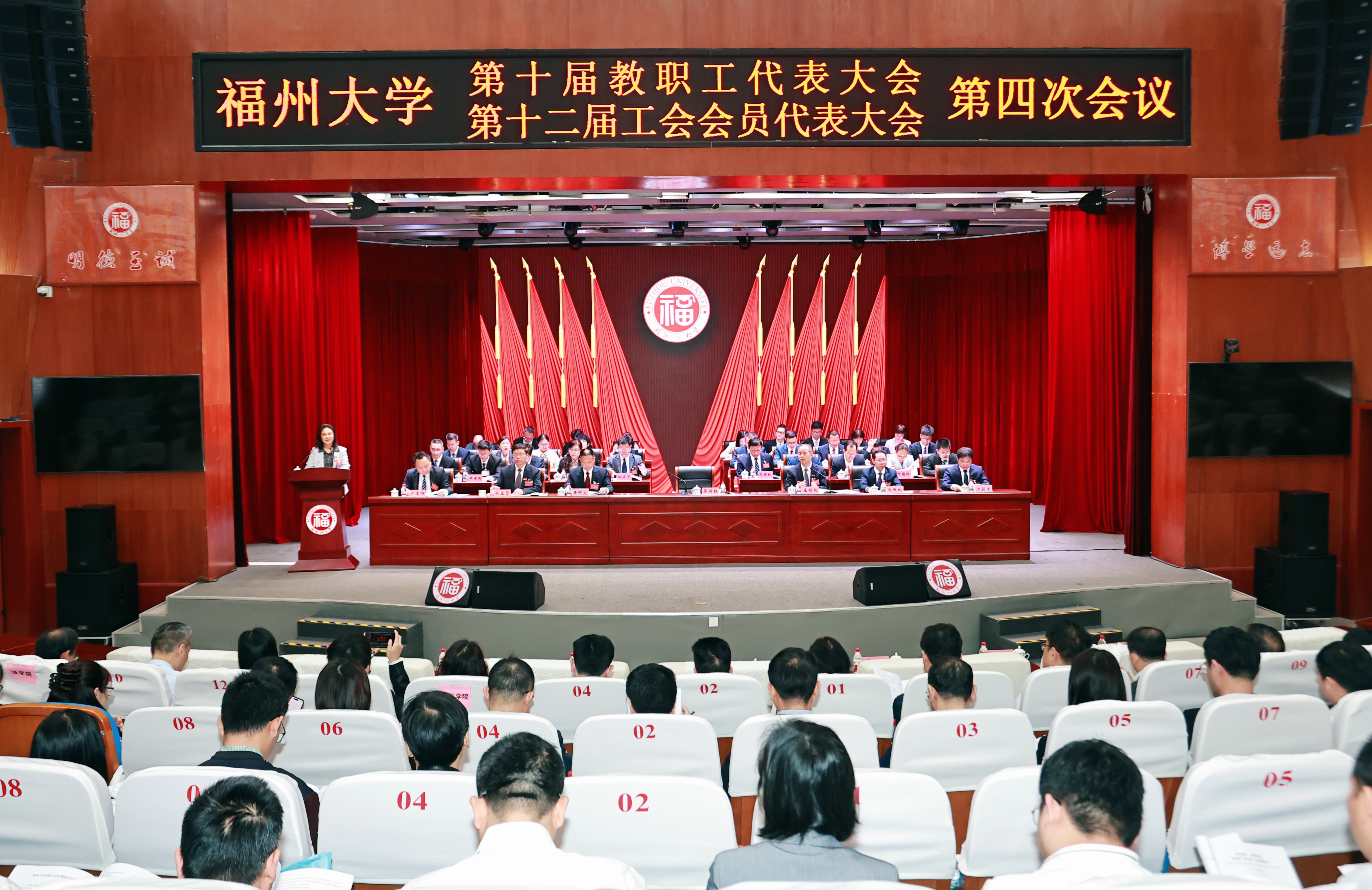 融媒中心讯/4月16日,福州大学第十届教职工代表大会第四次会议暨第十二届工会会员代表大会第四次会议在旗山校区图书馆博学厅召开。全体在家校领导出席会议,正式代表、特邀代表、列席代表等400余人参加会议。校党委副书记王向阳主持大会开幕式,校党委常委、副校长张亚雷致开幕词。福州大学十届四次教代会暨十二届四次工代会开幕式开幕式上,校党委书记、校长吴明红院士作题为《凝心聚力奋勇争先为实现“福大梦”而不懈奋斗》的...