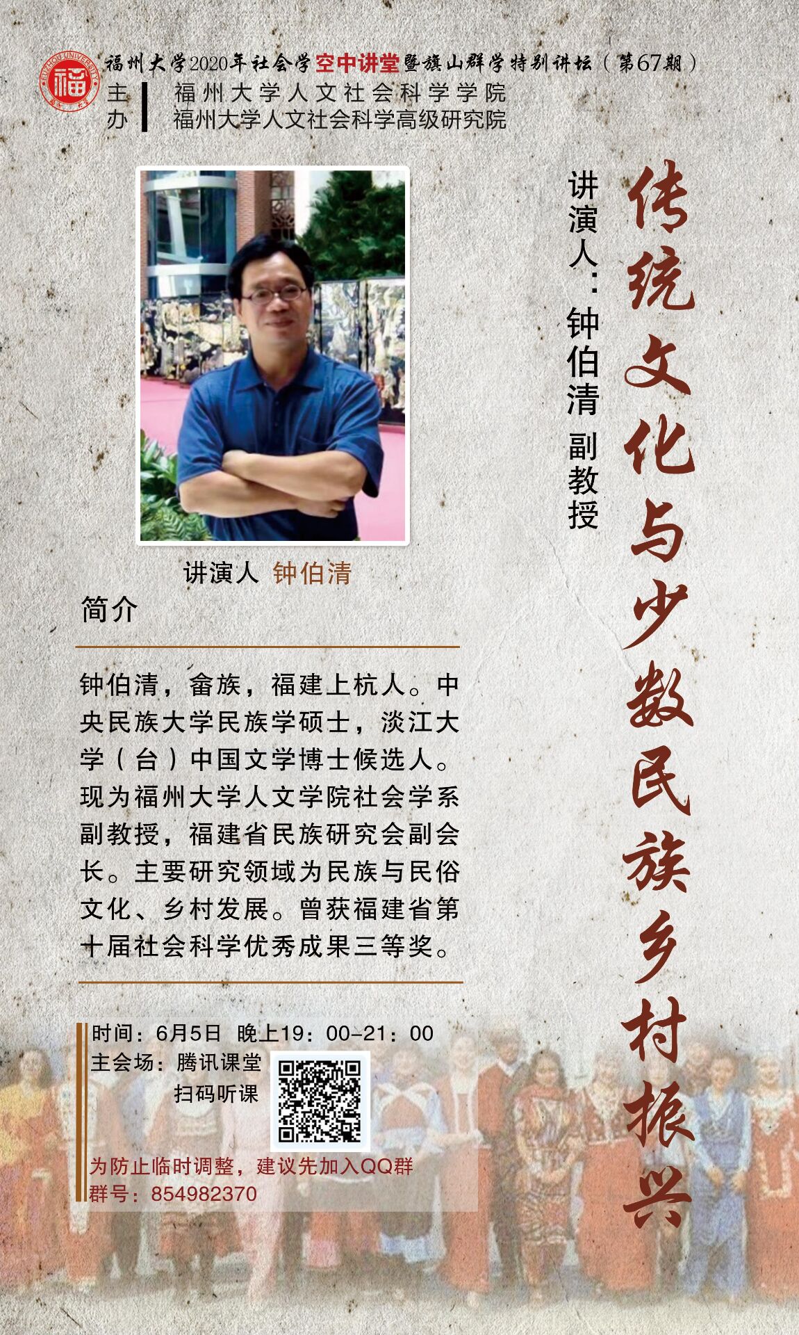 演讲人简介:钟伯清,畲族,福建上杭人。中央民族大学民族学硕士,淡江大学(台)中国文学博士候选人。现为beat365平台官方网站人文学院社会学系副教授,福建省民族研究会副会长。主要研究领域为民族与民俗文化、乡村发展。曾获福建省第十届社会科学优秀成果三等奖。
