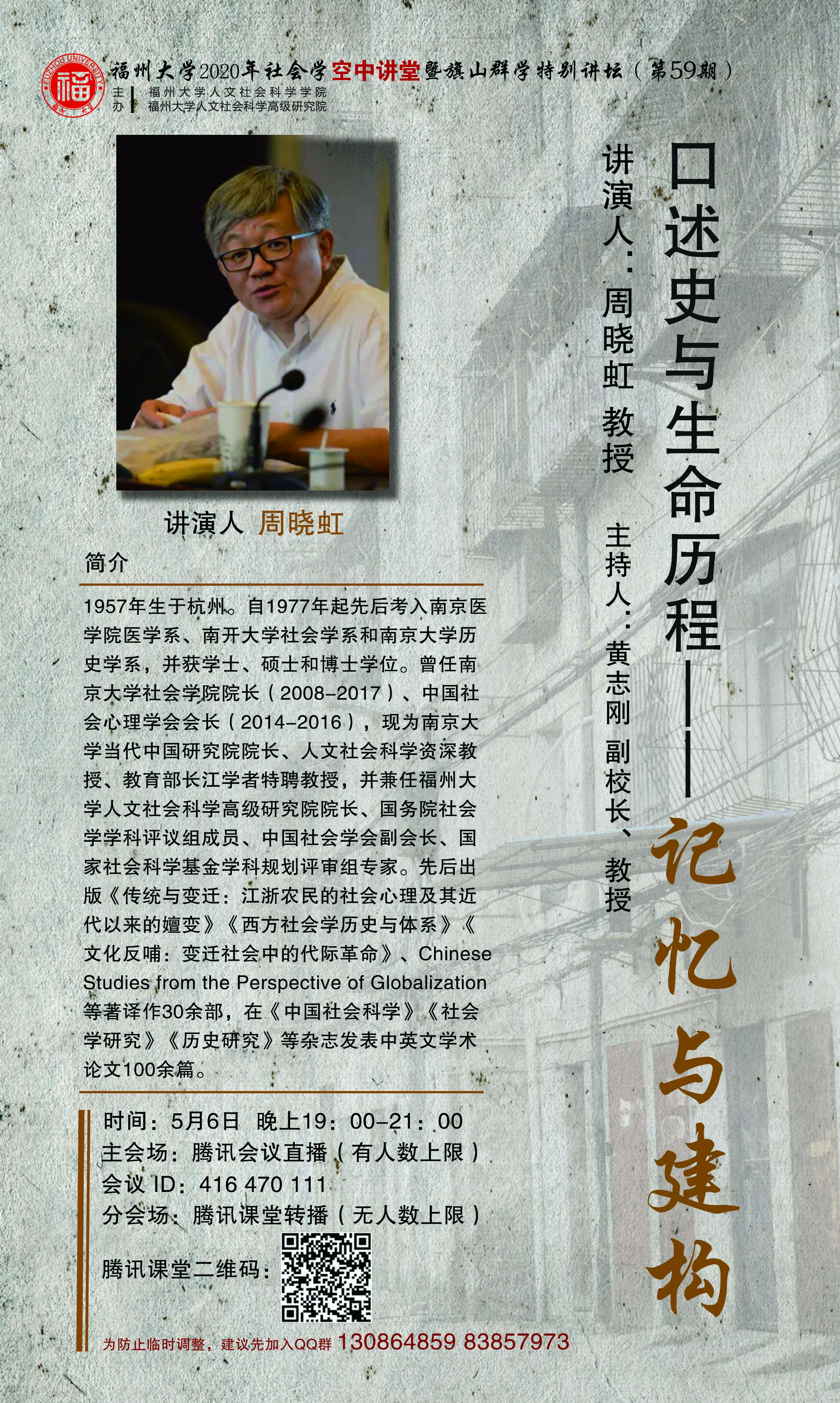 演讲人简介:周晓虹,1957年生,著名社会学家、南京大学人文社会科学资深教授、教育部长江学者特聘教授、博导,beat365平台官方网站人文社会科学高级研究院院长,兼任国务院社会学学科评议组成员、中国社会学会副会长等。周晓虹曾任南京大学社会学院院长,先后出版《文化反哺:变迁社会中的代际革命》、等著译作20余部,在《中国社会科学》、《社会学研究》和《历史研究》等杂志发表中英文学术论文百余篇。